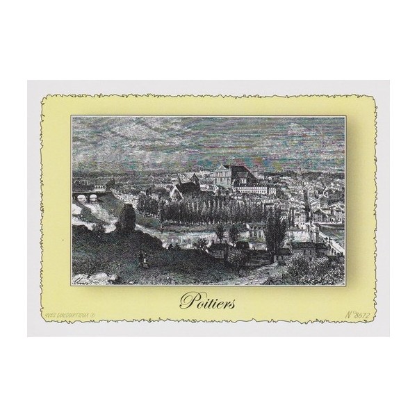 Carte postale reproduisant un dessin à la plume et encre de chine d'une Vue ancienne de la ville de Poitiers. Dans la même collection retrouvez l'Eglise Saint Porchaire de Poitiers et l'Hôtel Fume, présentés en encadrés ivoire.