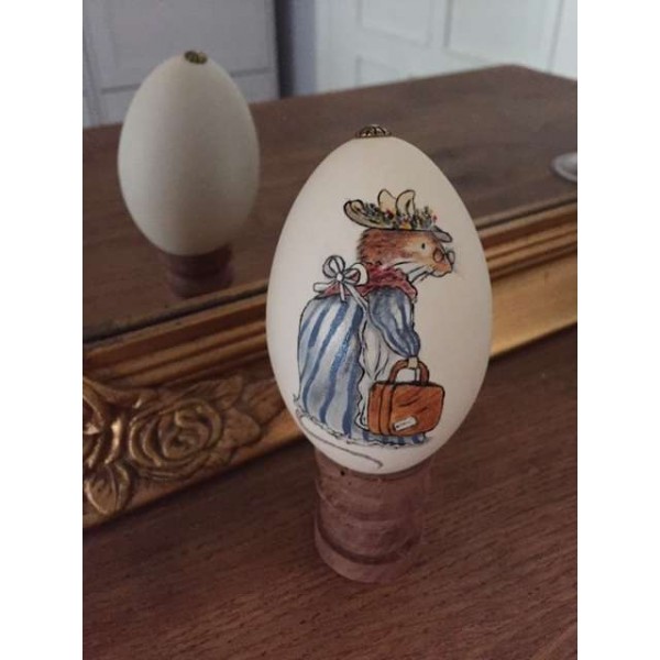 Un bel oeuf peint à la main à offrir pour Pâques : La Petite voyageuse ! Une souricette humanisée,valise à la main, lorgnons sur le bout du nez, regarderait-elle les horaires des trains ? Chapeautée et dans sa belle robe à rayure, cette petite souris est peinte avec le souci du détail. Vendue avec socle en bois tourné.