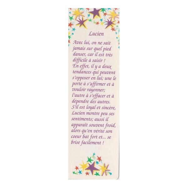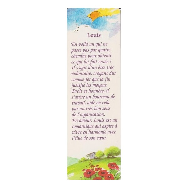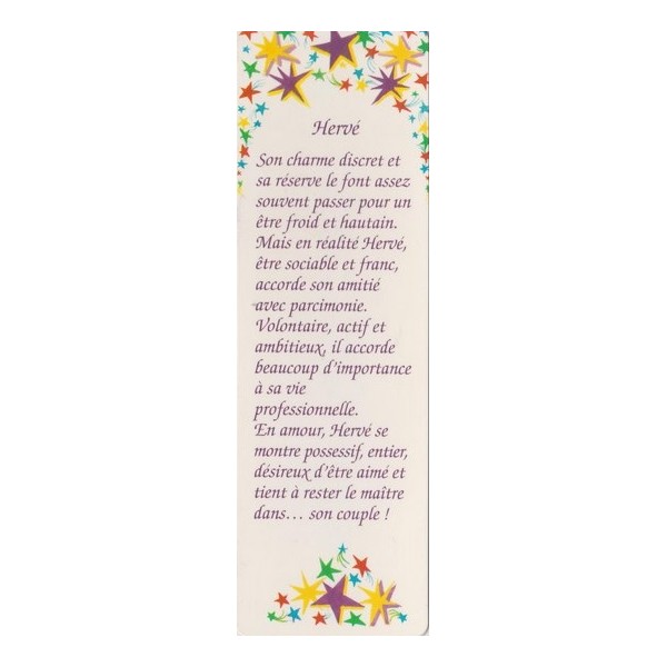 Grand choix de marque-pages avec prénoms masculins. Retrouvez pour chaque prénom ses particularités, ses grands traits de caractère, qualités et défauts. La signification du prénom peut être amusante et parfois surprenante. Idée cadeau d'invité à poser à la place de chaque convive, ce marque-pages se transforme alors en marque-places le temps d'une soirée et repart avec votre invité en cadeau souvenir. 5 cm x 15,5 cm.
