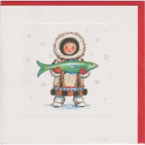 Carte de Noël originale : un Noël au pôle Nord en compagnie d'un jeune Inuit ! Sauvons la banquise si nous voulons qu'il puisse nous offrir ce spectacle encore longtemps ! Portant une tenue traditionnelle et colorée, les pommettes rouges de plaisir il nous présente sa plus belle prise, probablement le poisson qui pour lui correspond à notre célèbre dinde de Noël ! Format 14 cm x 14 cm avec enveloppe rouge