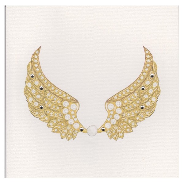 Carte exceptionnelle de Noël avec des ailes d'ange d'un dessin très fin, décor main avec éléments Swarovski. Cette carte double, carrée et raffinée est vendue avec son enveloppe rouge - Format 16 cm x 16 cm